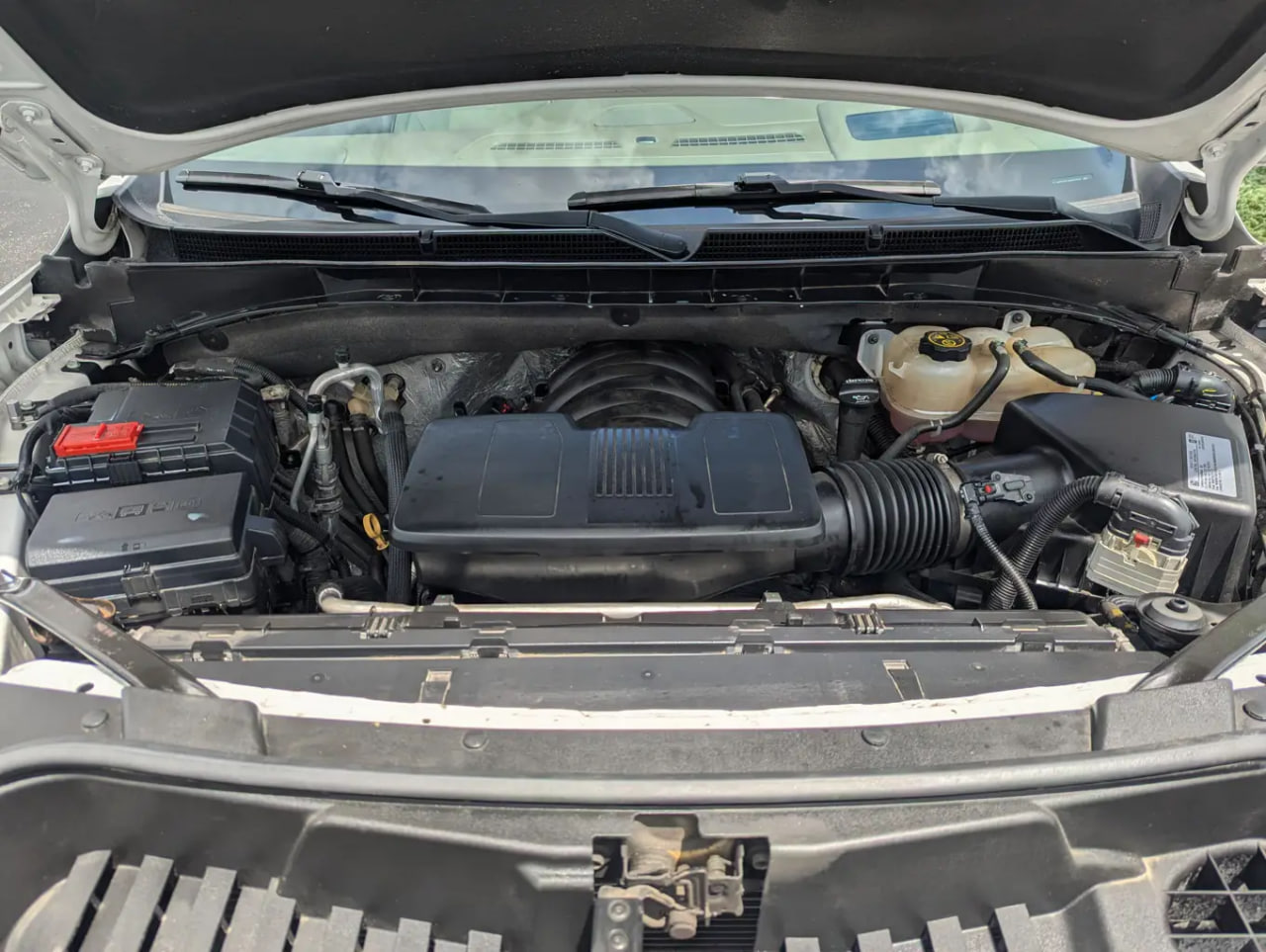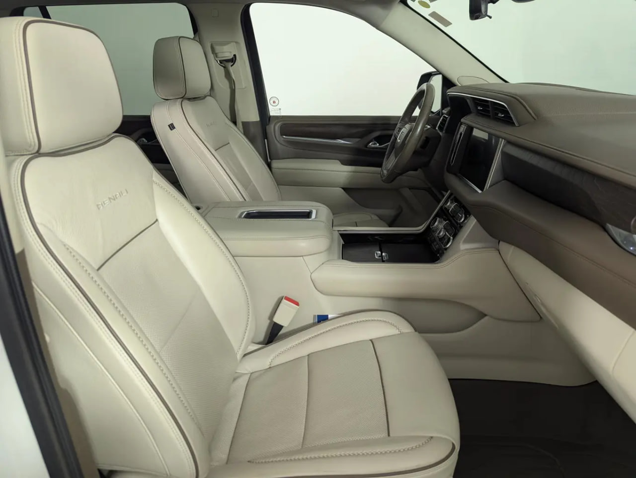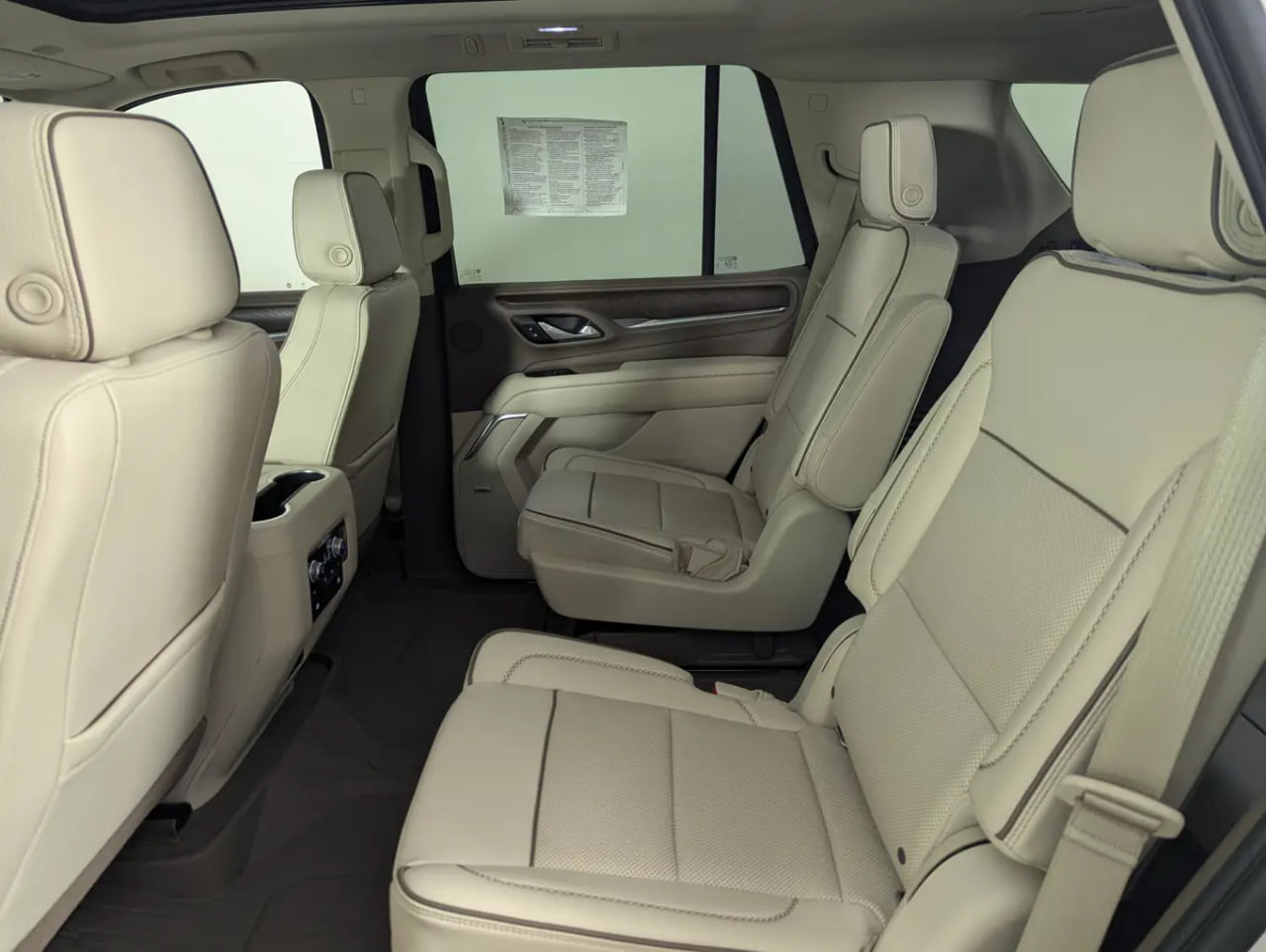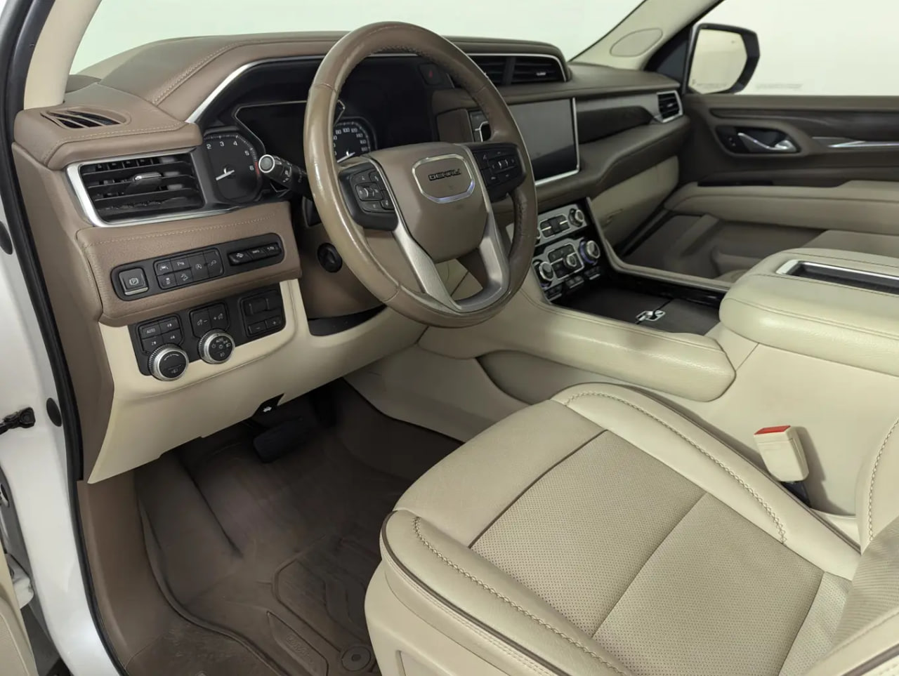 Power is supplied by the robust 6.2L EcoTec3 V8 engine, paired with a 10-speed automatic transmission and four-wheel drive, offering confident performance whether cruising or towing. The exterior is finished in White Frost Tricoat, while the interior showcases a refined Teak and Light Shale perforated leather cabin, creating a bright and upscale atmosphere.